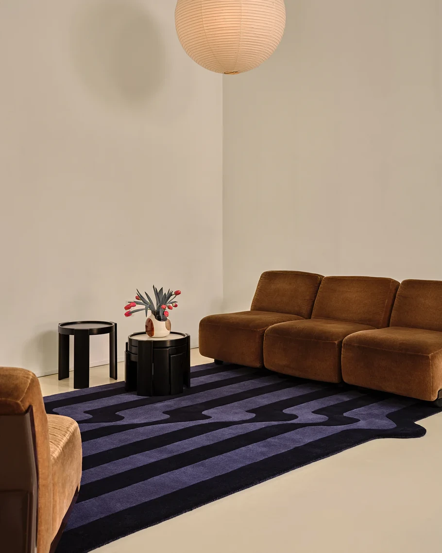 Noctiwave combines blue and black tones in a fluid wavy pattern. Handmade from New Zealand wool, it adds depth and contemporary movement to modern interiors.
