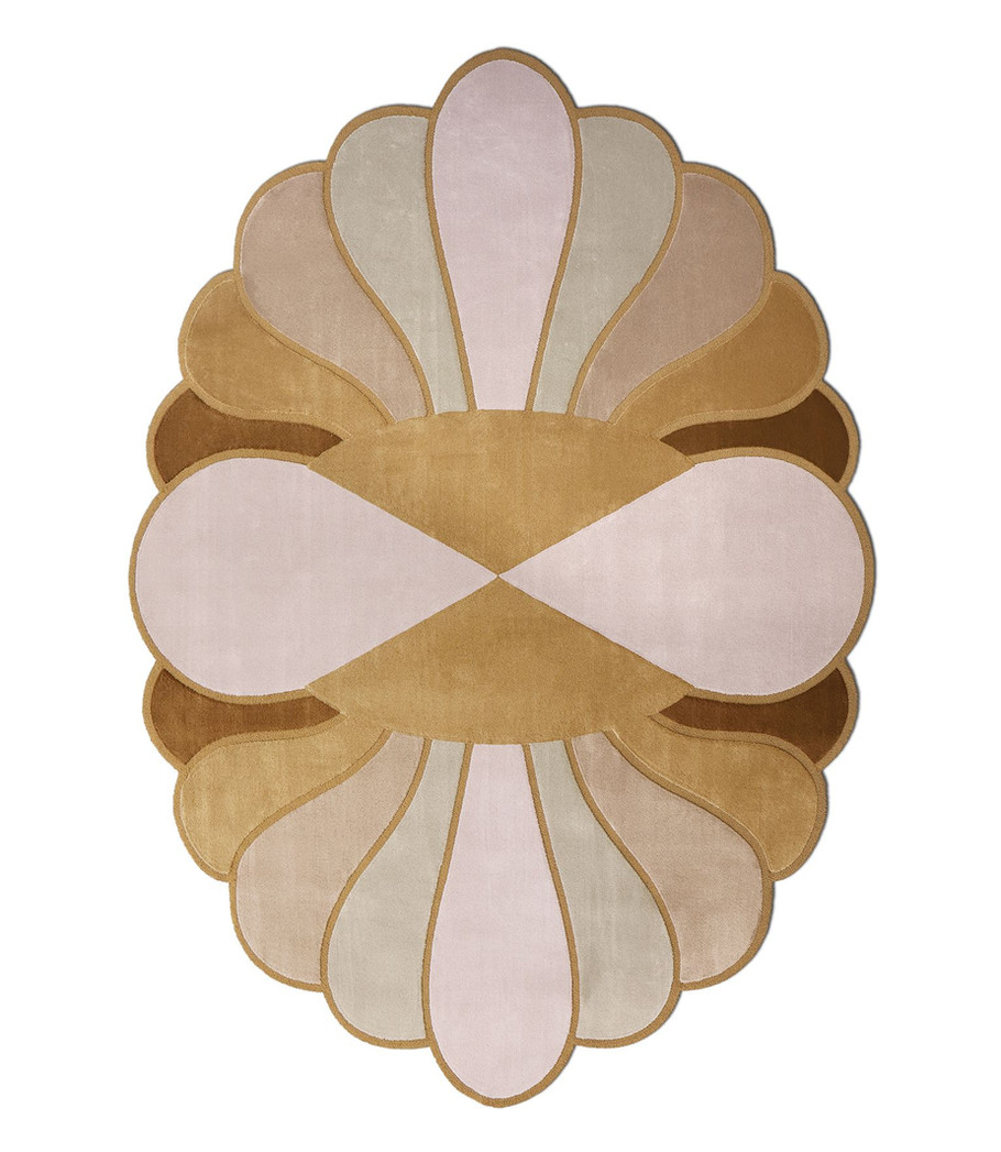 Florentia features a golden-brown flower-inspired shape with rich texture. Hand-tufted from New Zealand wool, it radiates warmth and refined elegance.