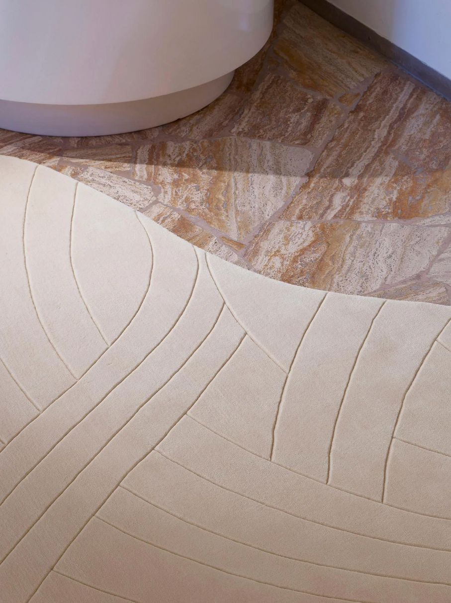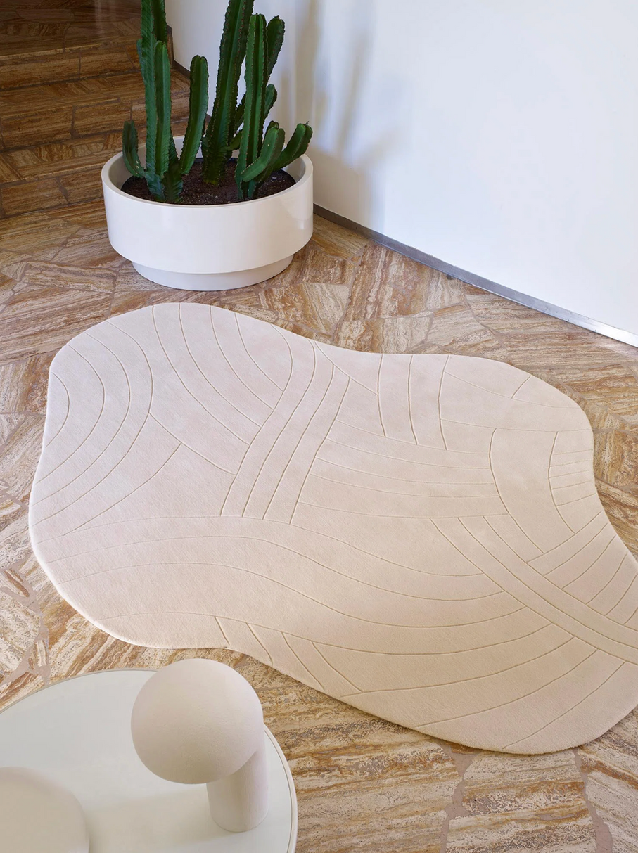 Shellwave evokes the gentle rhythm of coastal tides, a sculpted form in soft ivory tones, hand-tufted in New Zealand wool to bring serene movement and modern elegance to any space.